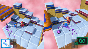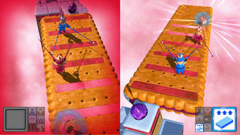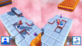 In this game you fight another player in order to get to your teeth, which wait for you on the other player's platform. For you to get on the other platform you have to collect pickups that give you special powers allowing you to transform the arena to your favor or your enemys disadvantage - or you can directly influence him to slow down or disturb his game. You can decide how you want to play.